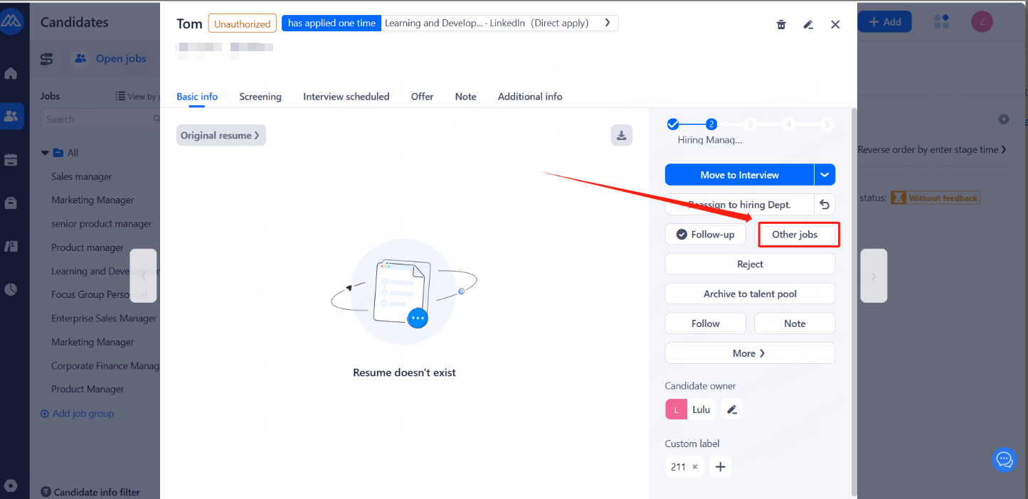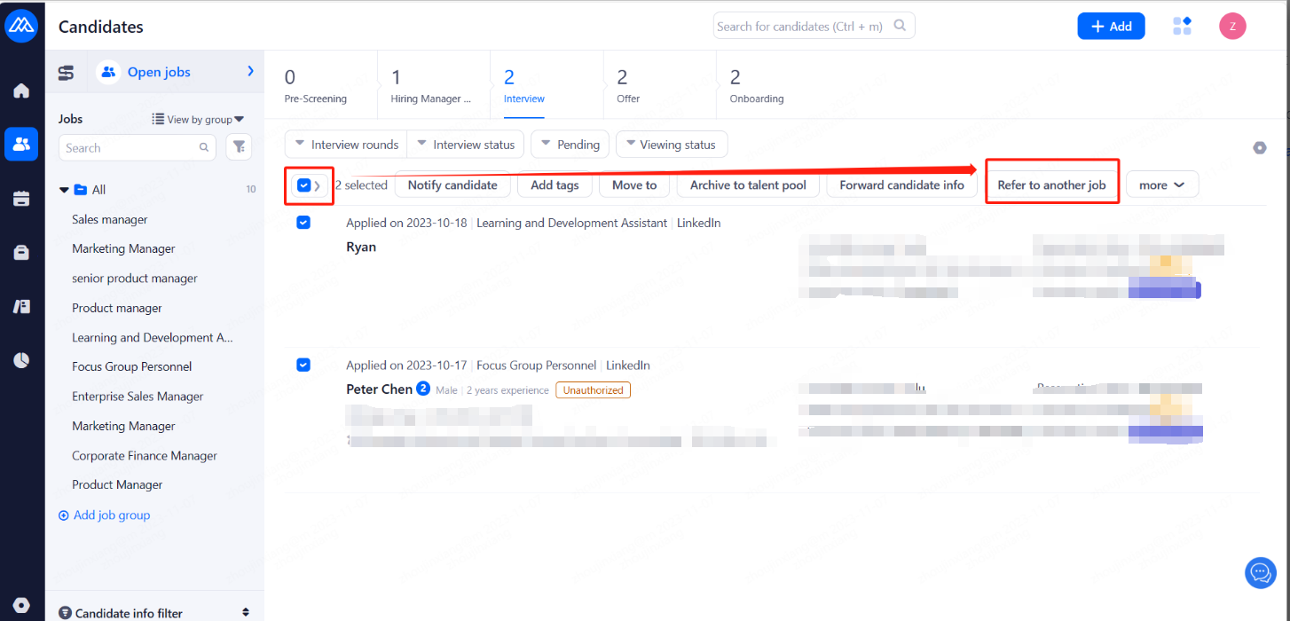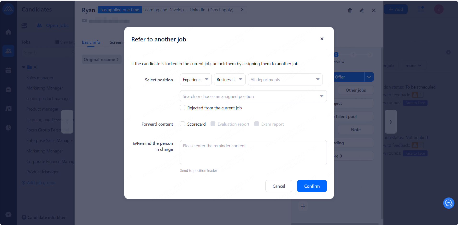 Candidates who are not suitable for the current position, but are qualified for another position, can be recommended directly from the current position to another position. And you can choose whether or not to attach a portion of the previous interview or assessment information to the new position.