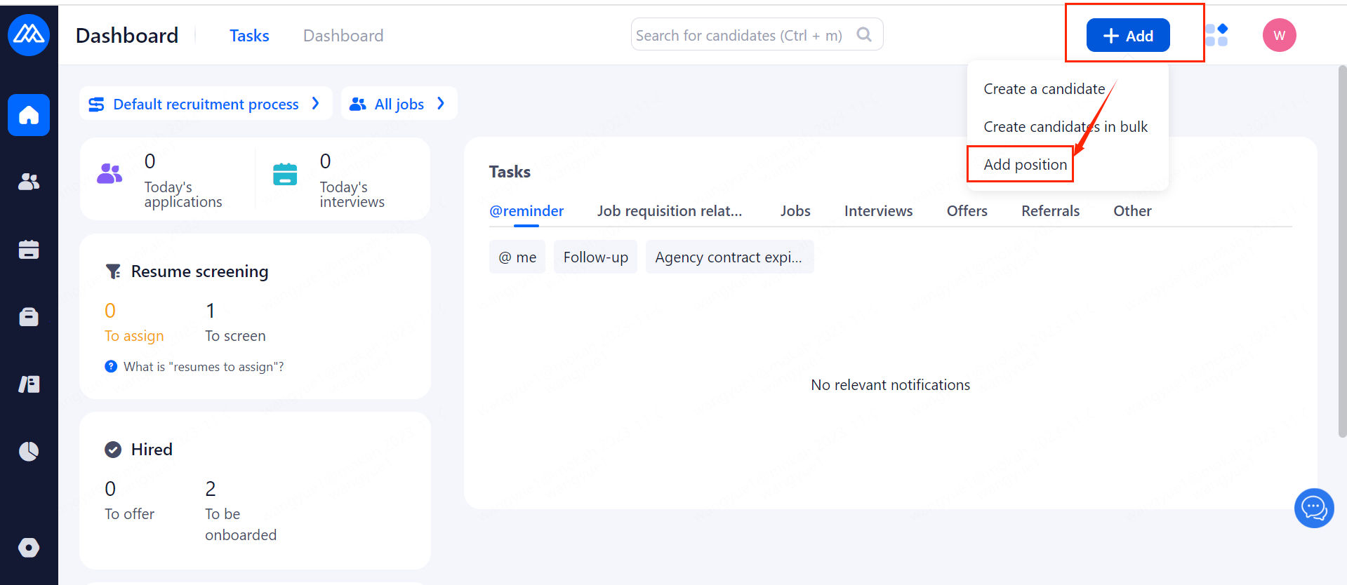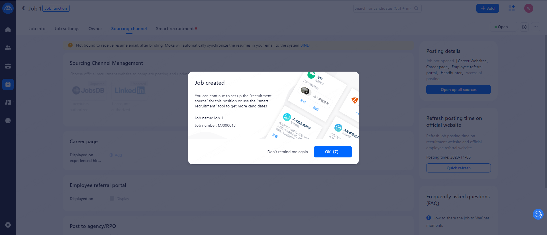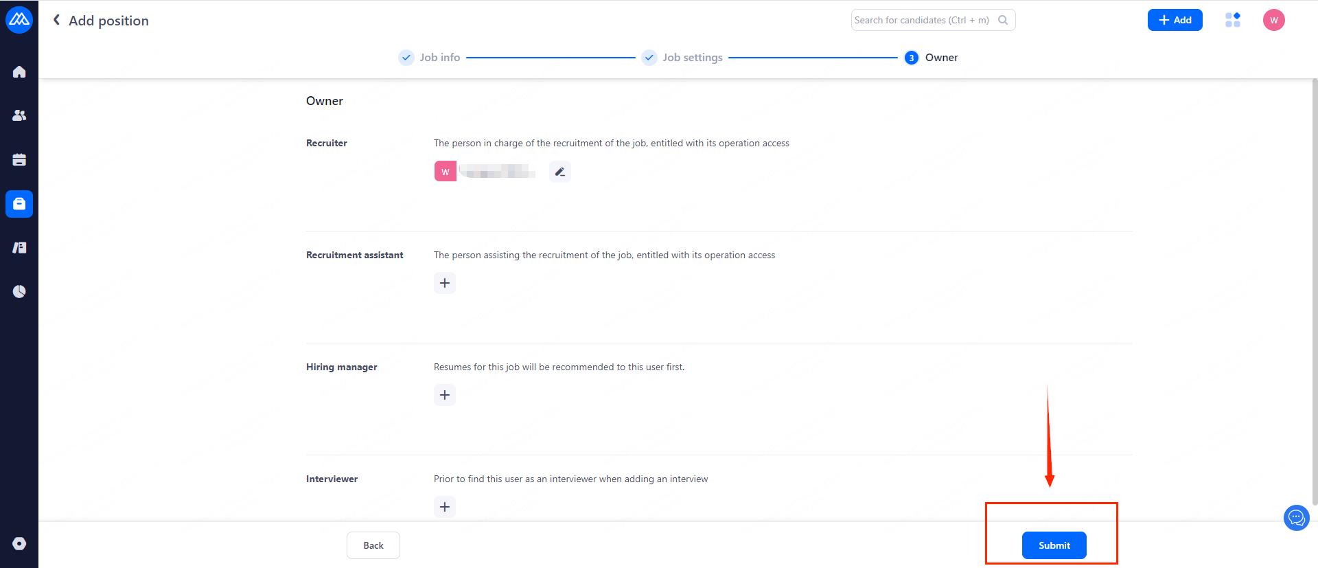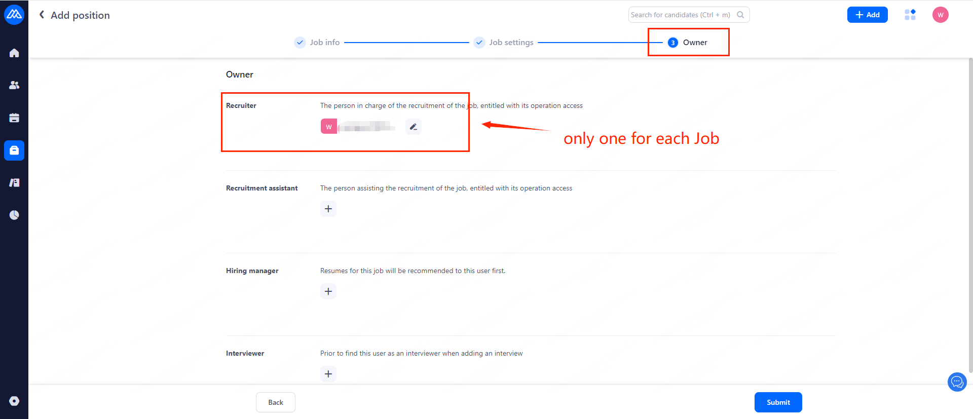d. In the owner page you can add owner for the job. There can be only one recruiter, who has all the operating permissions of the position. Recruitment assistant can have more than one person.