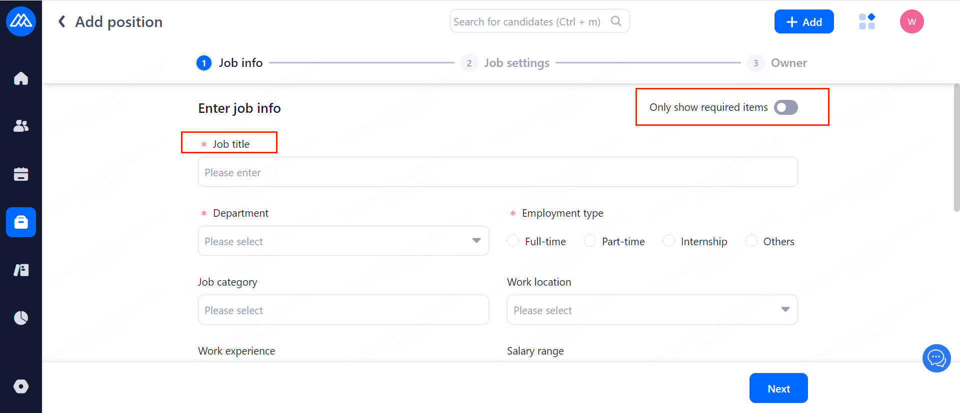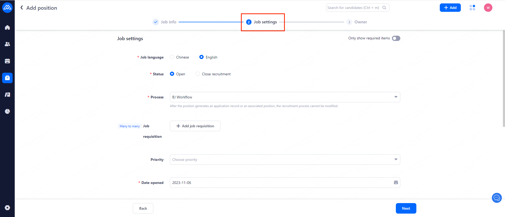c. Here fields such as job status, recruitment date/process, job requisition and other items can be set. After filling click on [Next] to move on the owner setting.