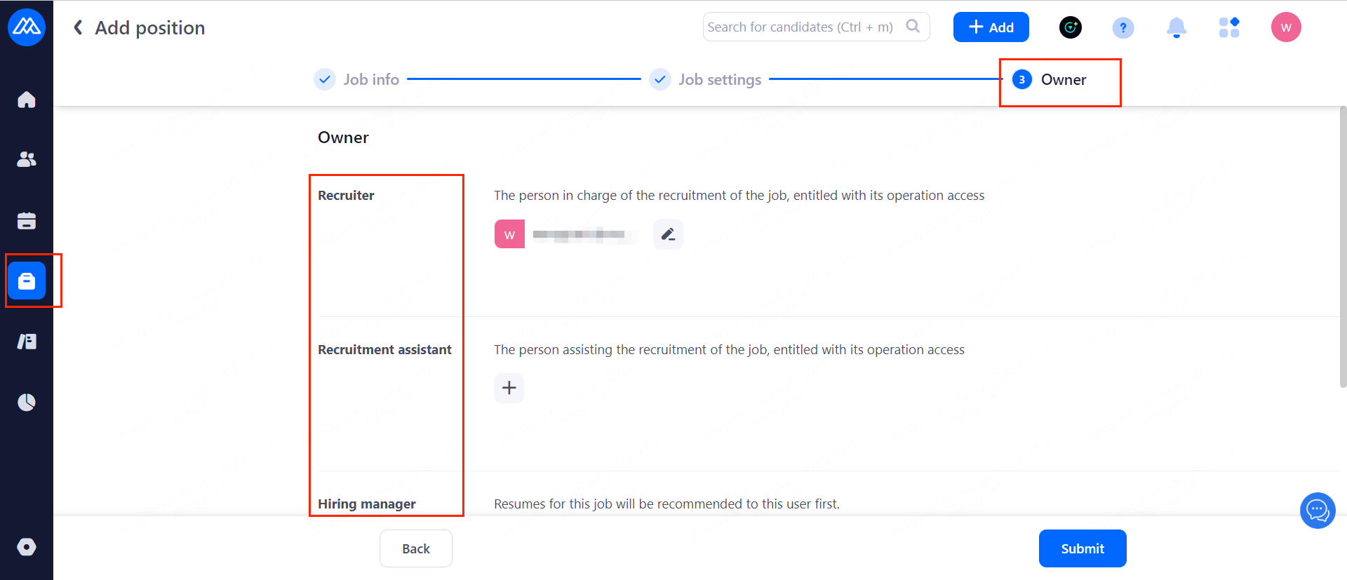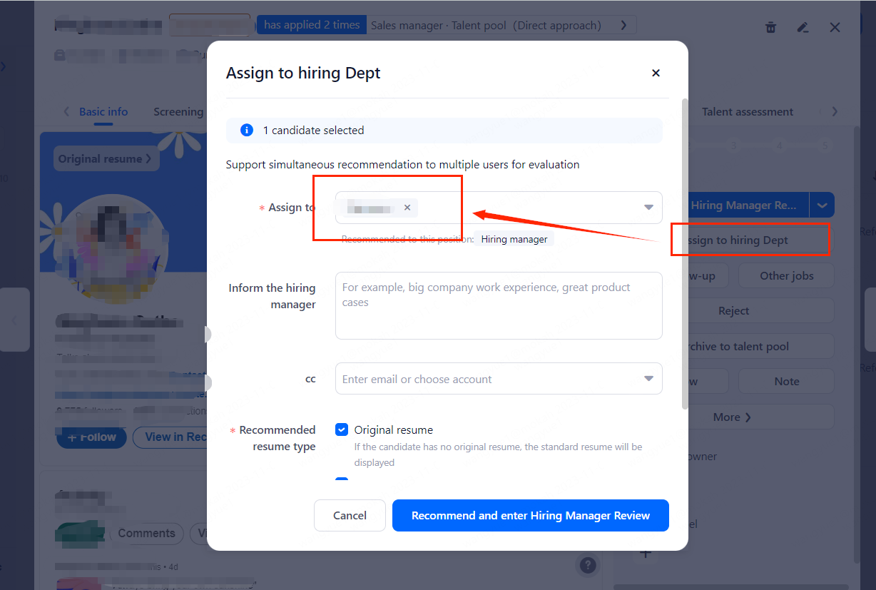 When assigning a candidate to hiring Dept, the hiring manager will be added to the input box automatically, and can be removed manually.