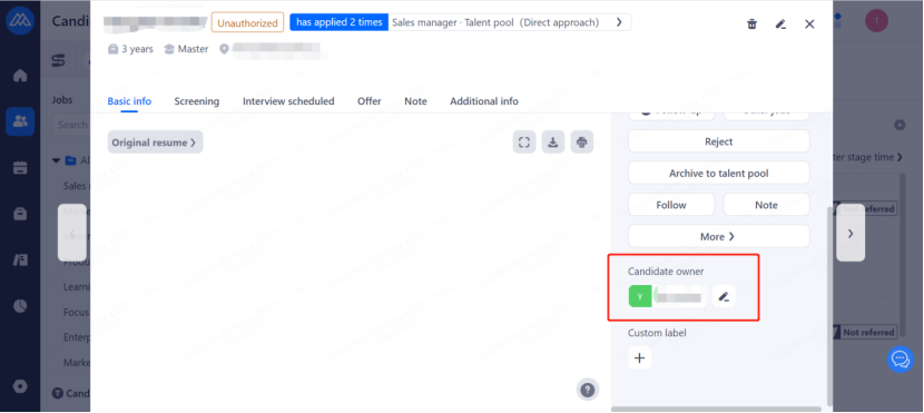The user who recommends the candidate to the hiring department for screening and transfers to the next stage is automatically regarded as the candidate owner.