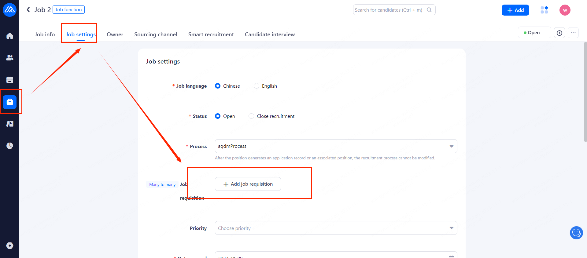 Operation path 1: [Jobs]--select your job--[Job settings]--[Add job requisition]