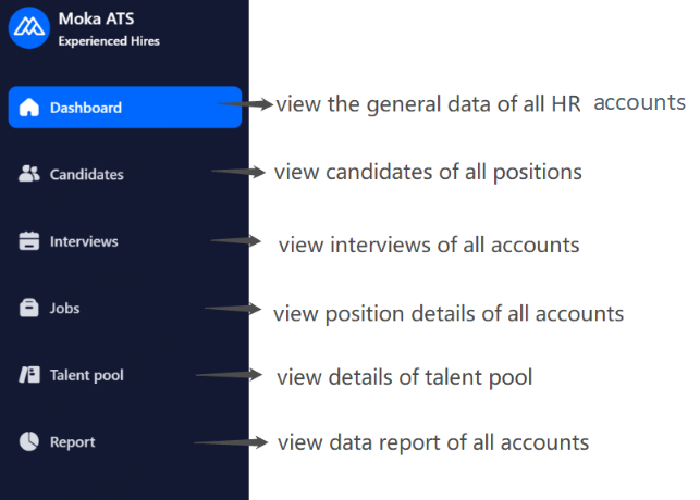 Admin: You can view the positions and the relevant candidates within the authorized department and can manage the team members as well. (usually the HR director of the branch or division)