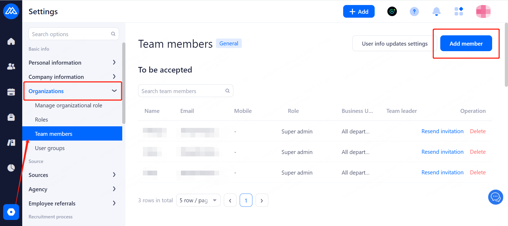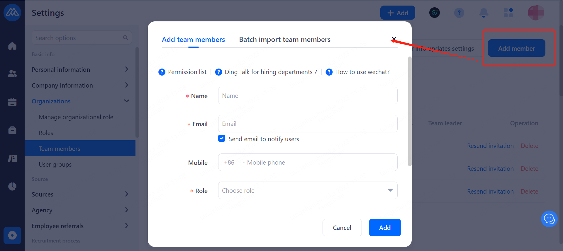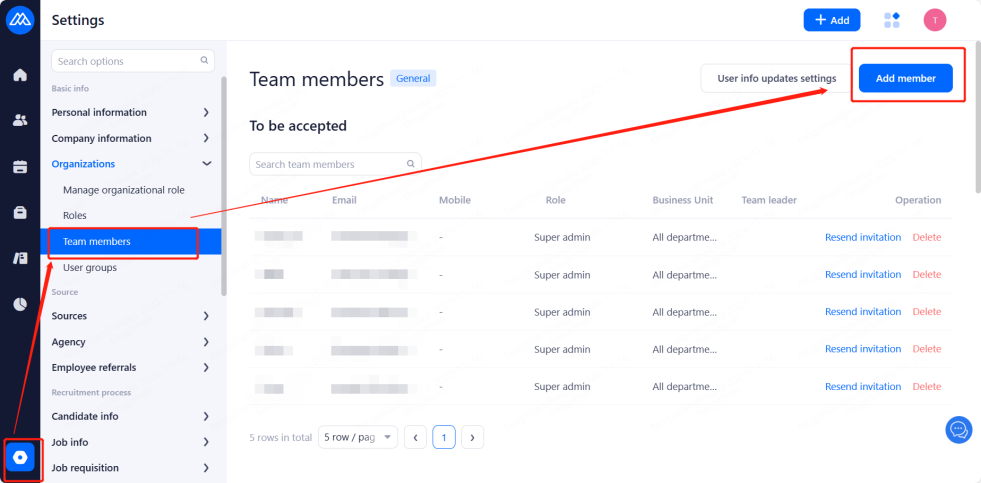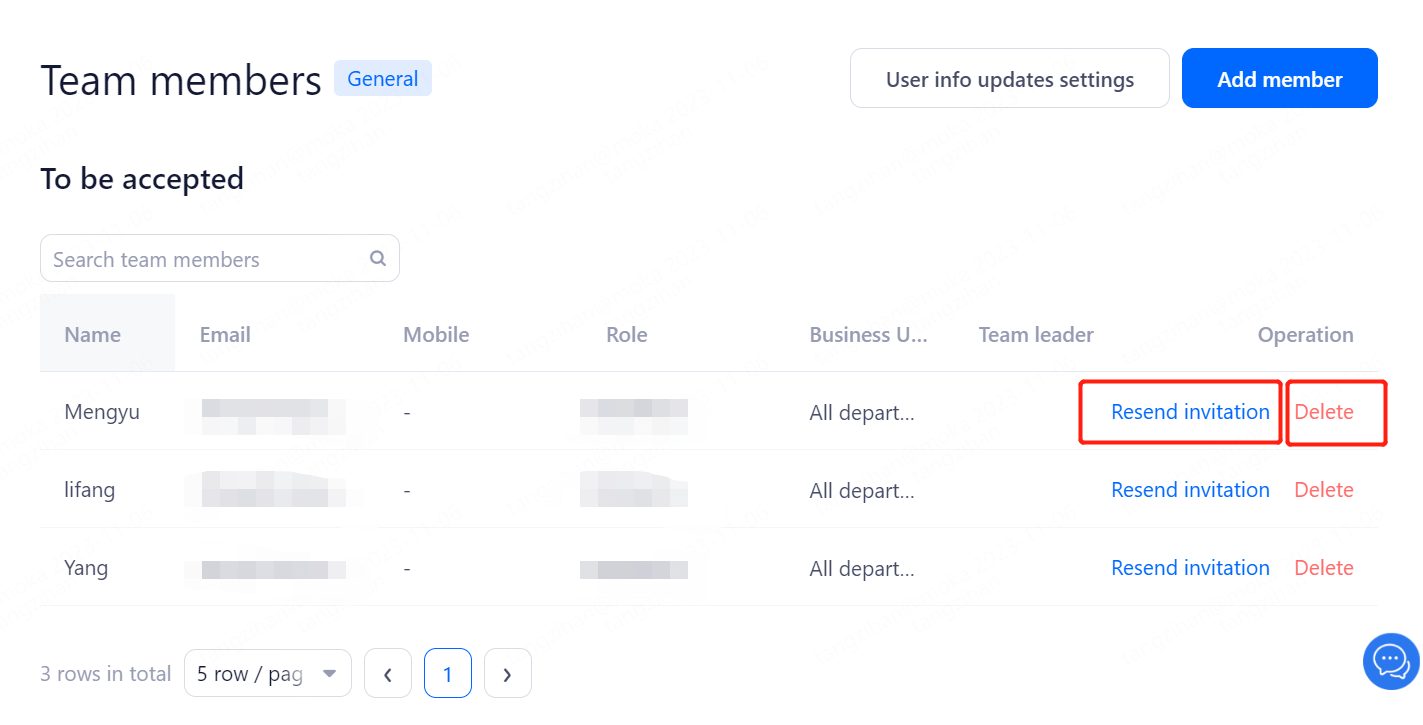 When there is a new team member joining the company, it is necessary for the super admin or general administrator to add and send a mail invitation, through which the invited person will activate the account and check the initial password of the account.