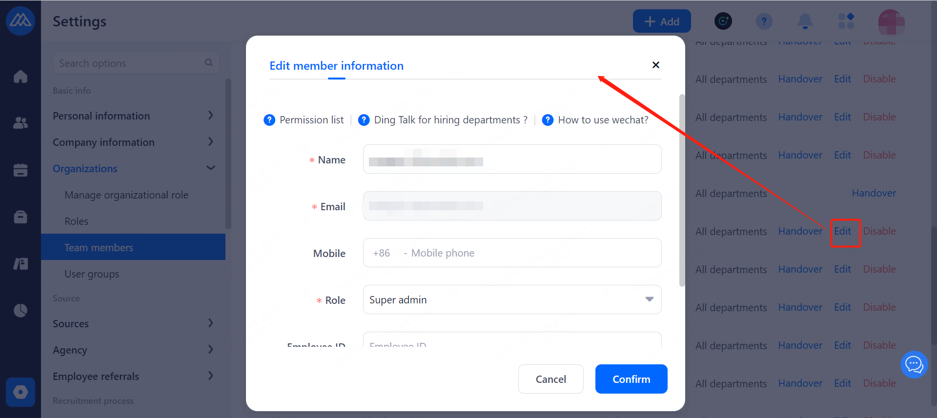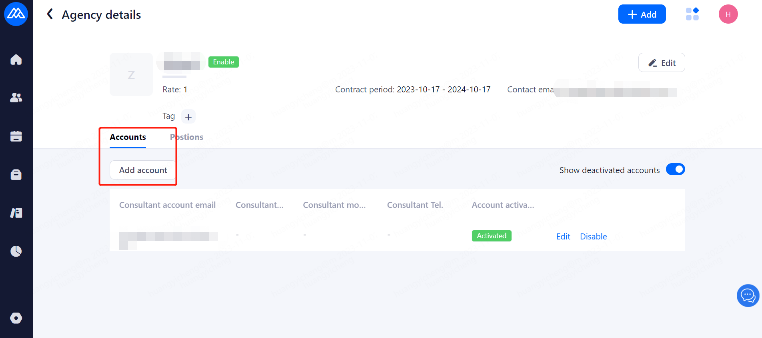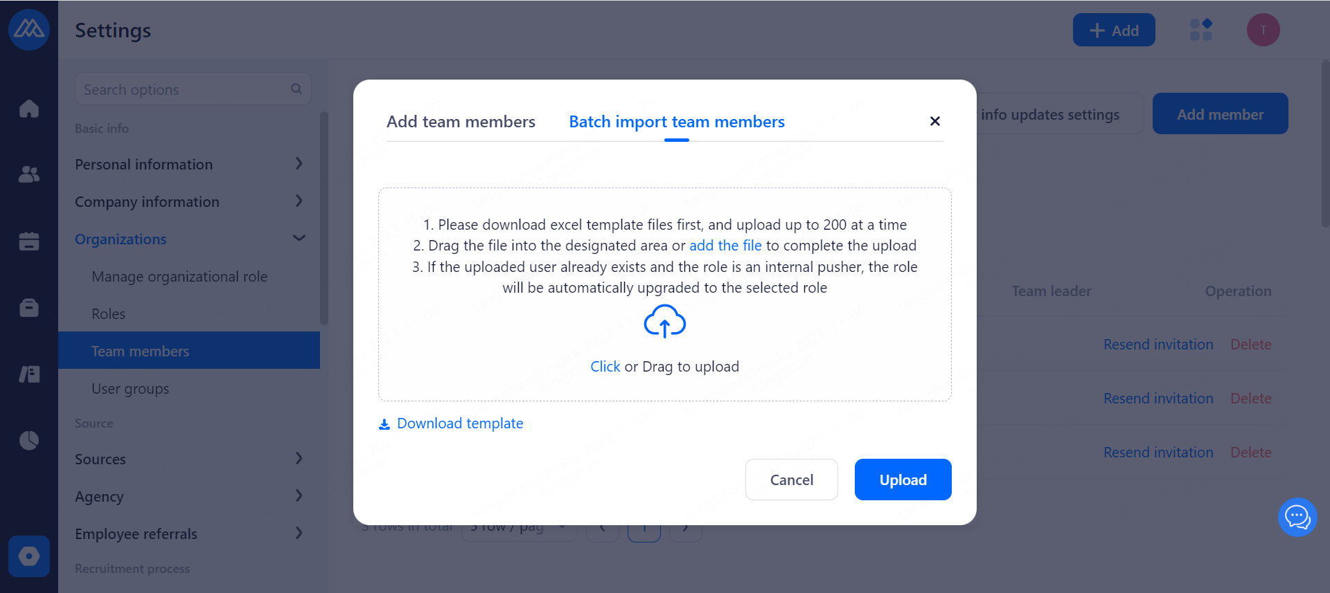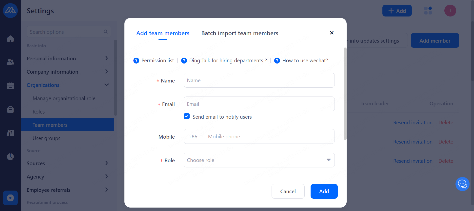When there is a new team member joining the company, it is necessary for the super admin or general administrator to add and send a mail invitation, through which the invited person will activate the account and check the initial password of the account.