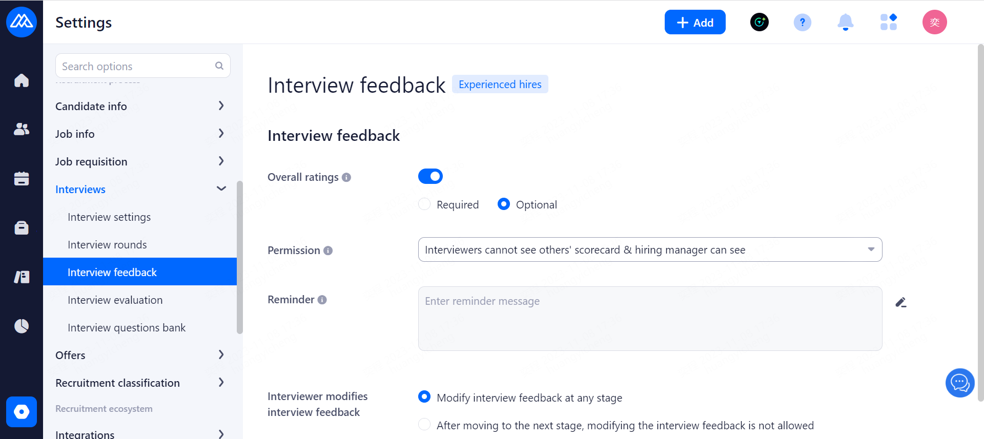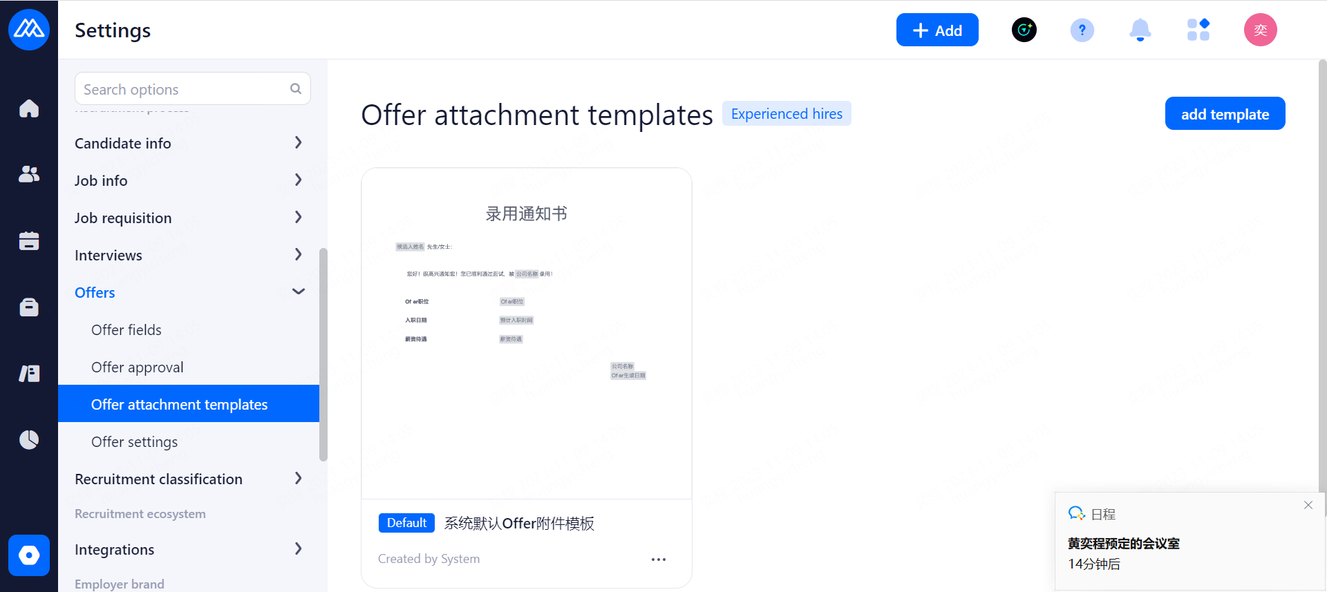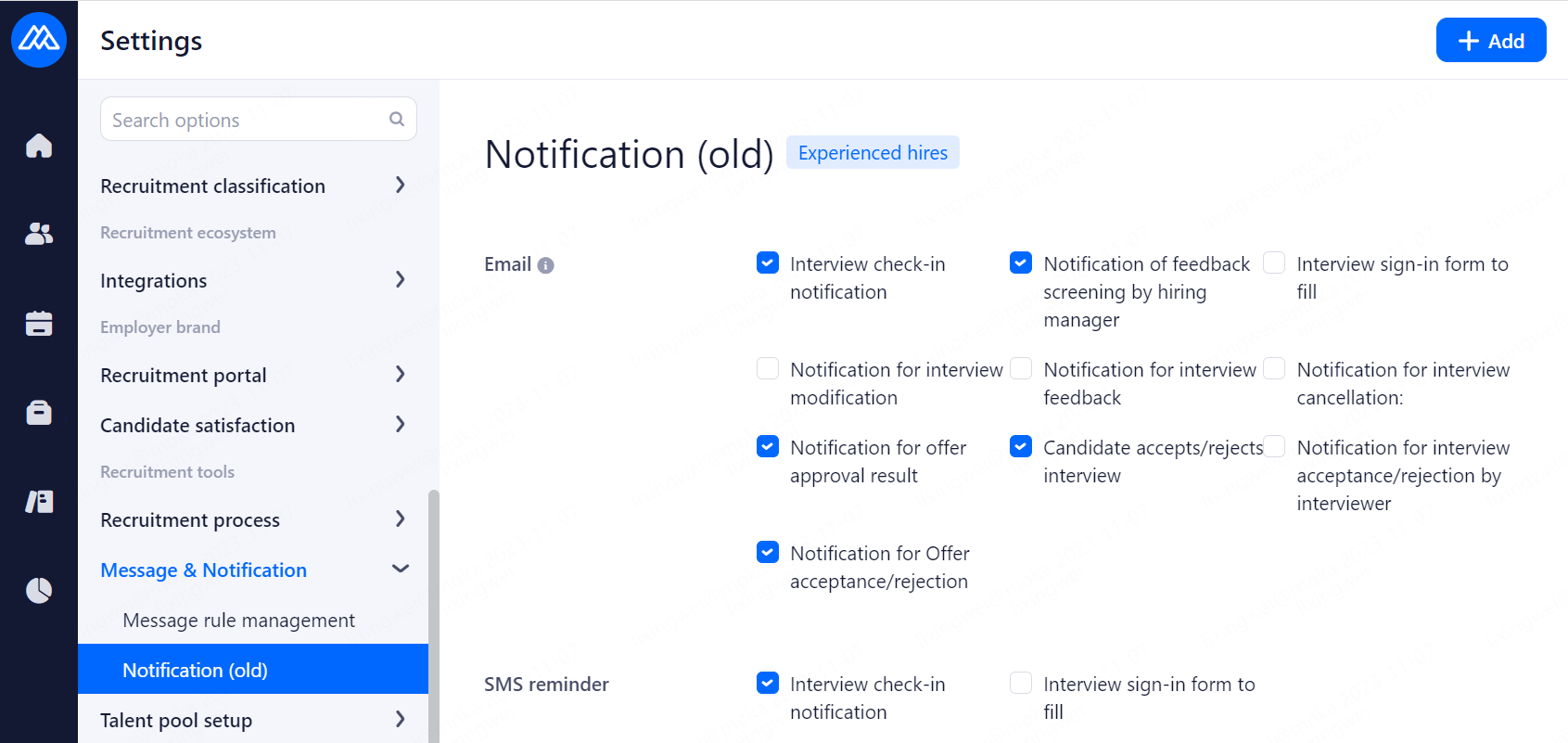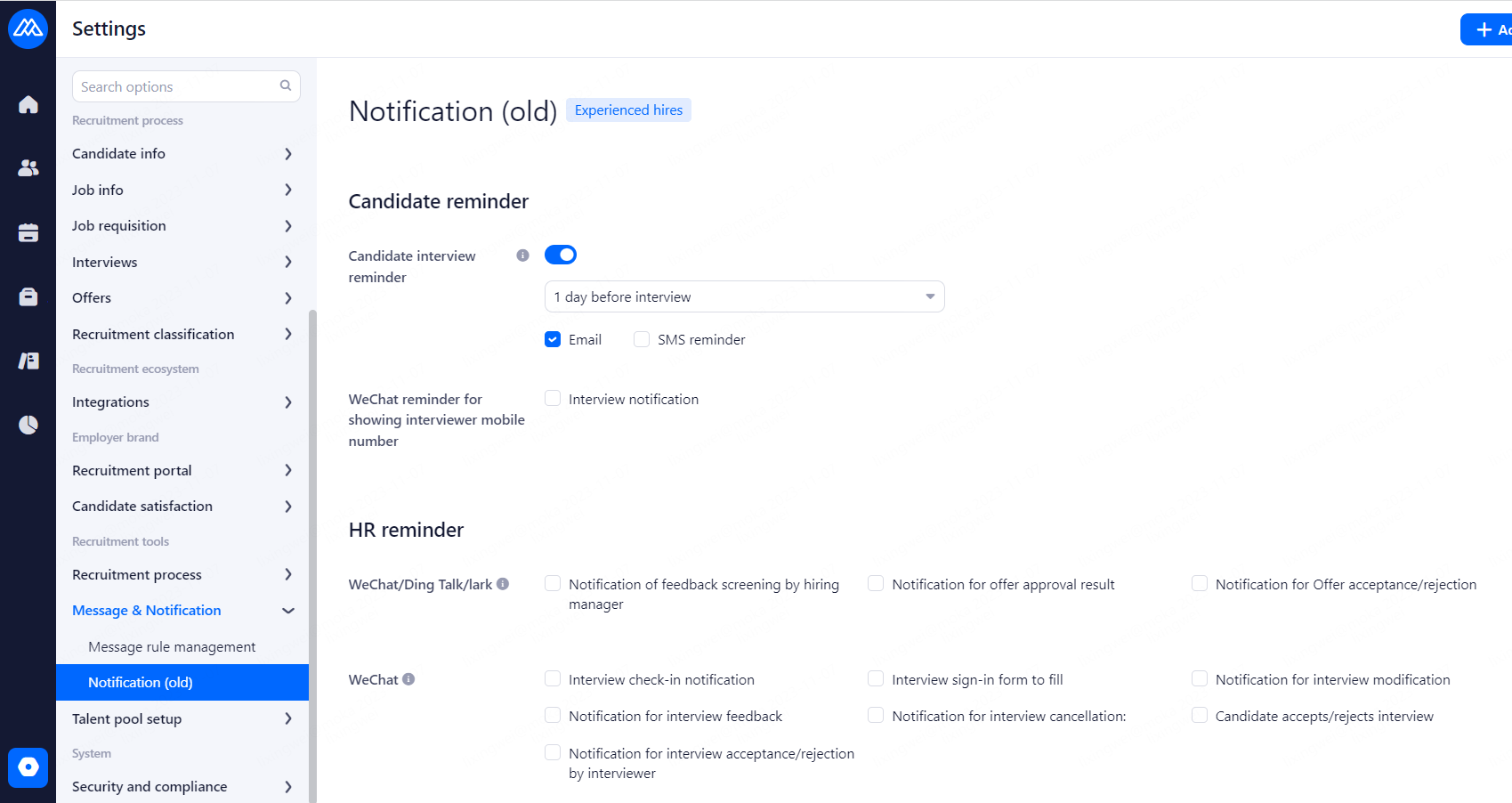 Reminders are sent to candidates before the interview. Email and SMS reminders are available, and SMS reminders need to be purchased in advance. Notification time: 2 hours before the interview, 1 day before the interview, 2 days before the interview and 3 days before the interview.