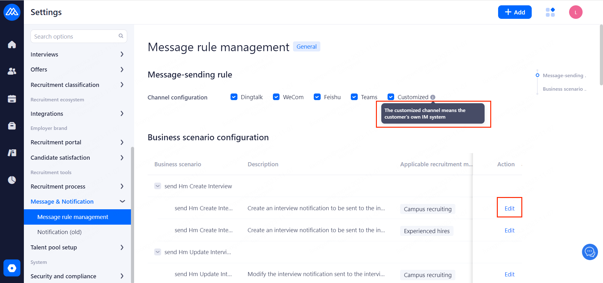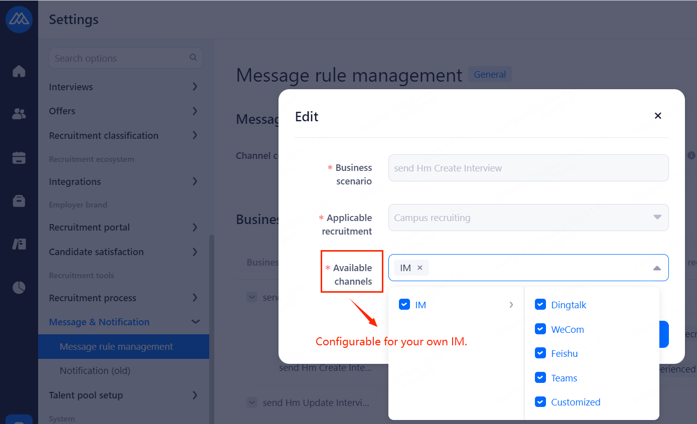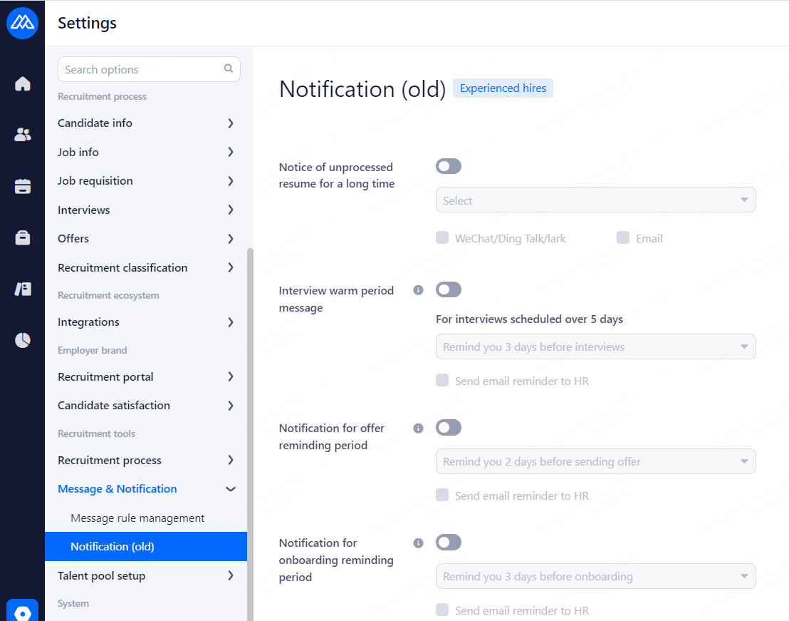 WeChat/Ding Talk/lark: Notify HR via WeChat、DingTalk and Lark when processing candidates status changed. Enable the service to use otherwise use email.