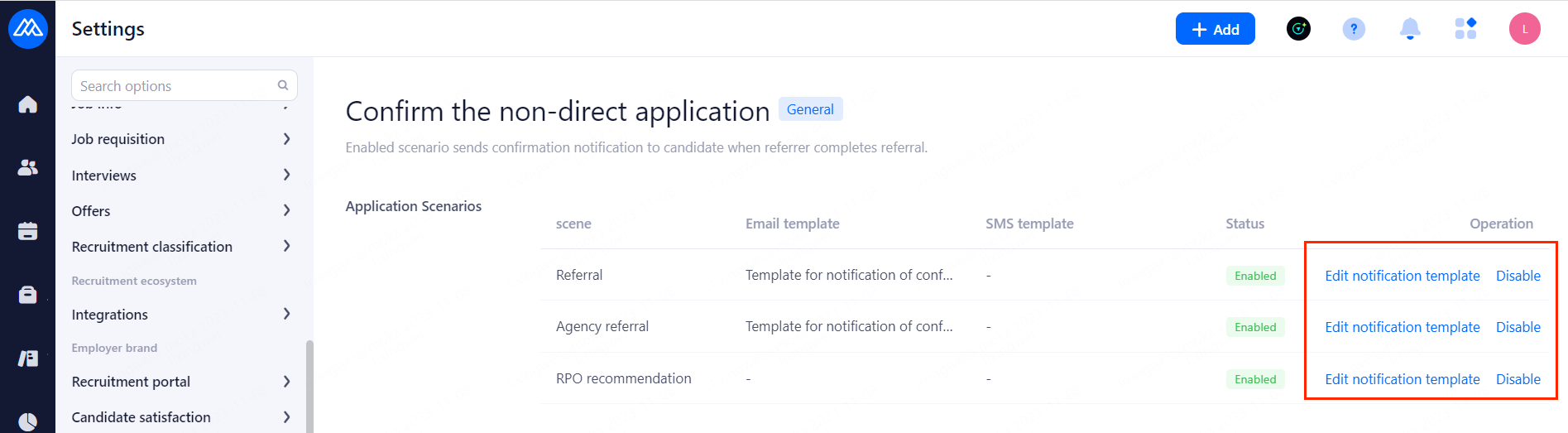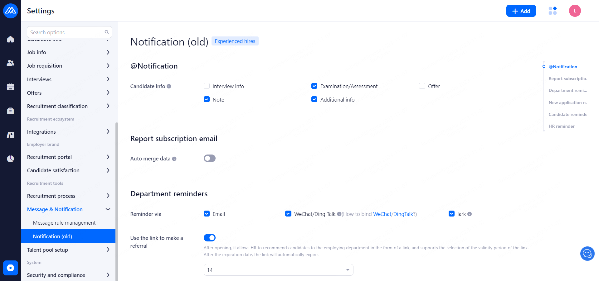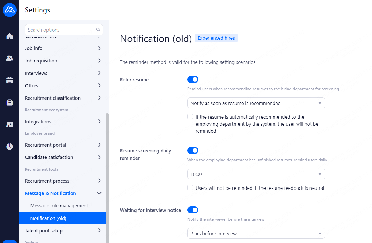 Refer resume: Email notification will be sent when the resume is sent to the employing department, and the system will send email notification by default when HR recommends the resume, and here you can set whether to send email notification when the system recommends the resume automatically. Notification methods: