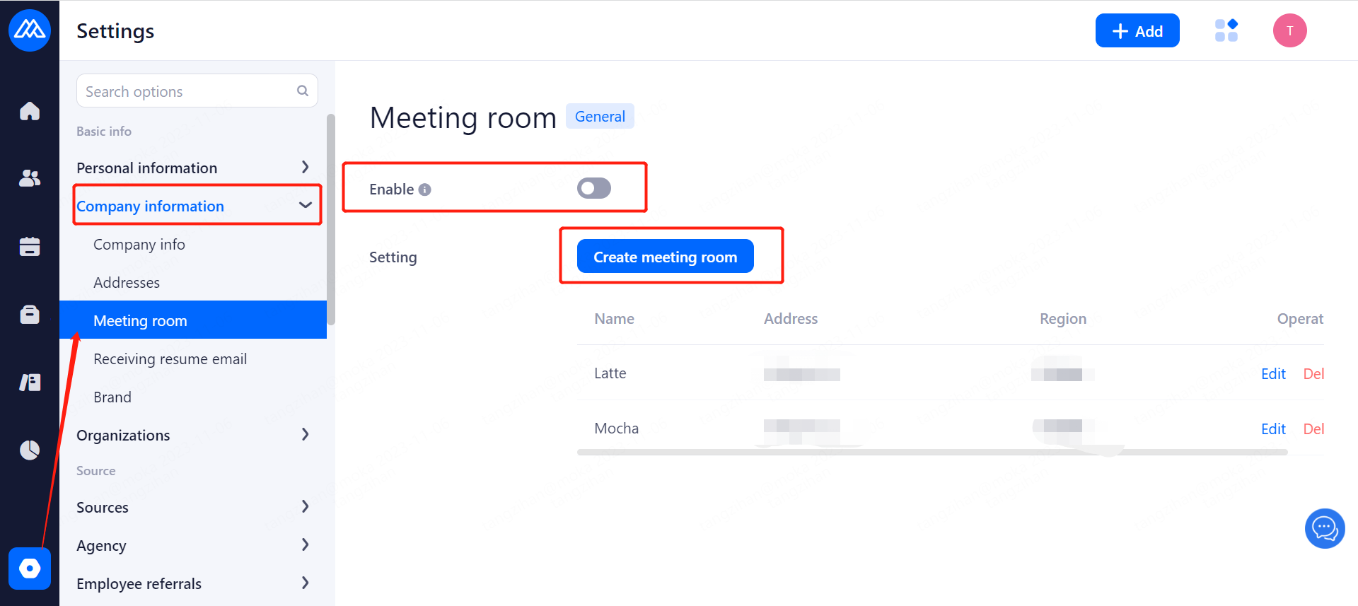 A switch can be used to control whether or not a selected meeting room is used, and multiple meeting rooms can be added to the same address. With the switch turned on, the conference room can be selected when scheduling an on-site interview.