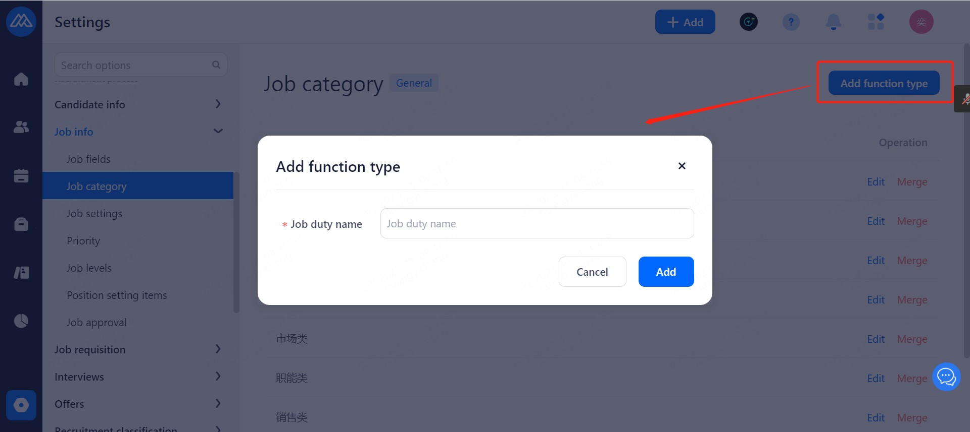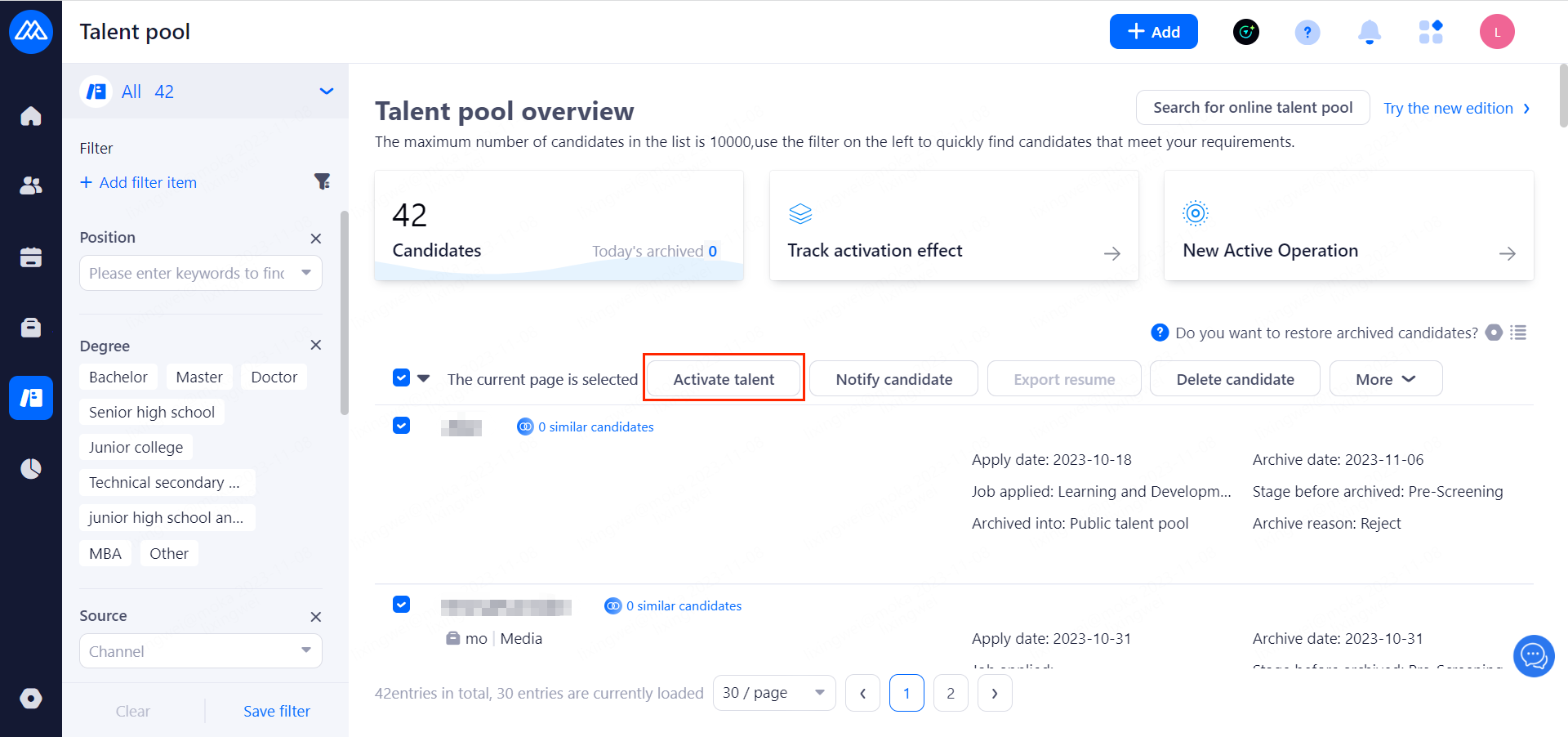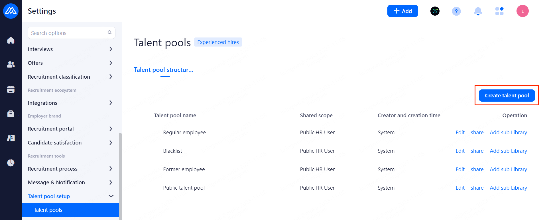 Shared Objects: Support by department, role, account authorization to the corresponding user's viewing privileges. System public, on-boarding, off-boarding, blacklisted talent pool only super administrator can set up private, subordinate talent pool.