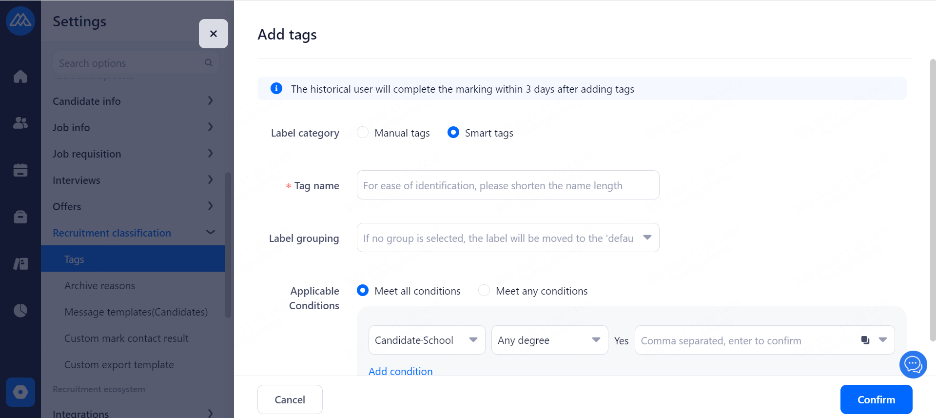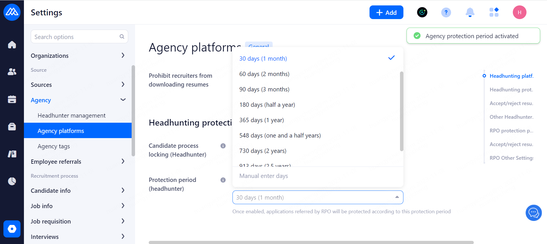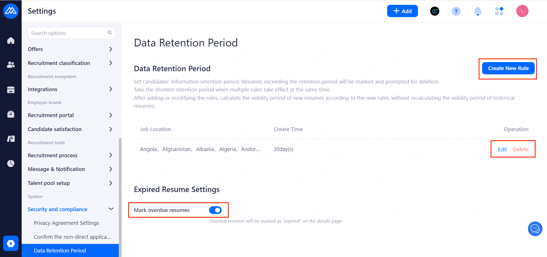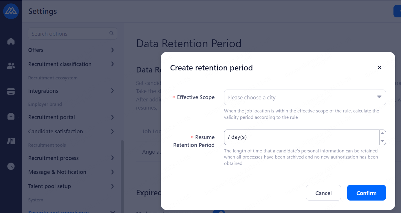 Set candidates' information retention period. Resumes exceeding the retention period will be marked and prompted for deletion.