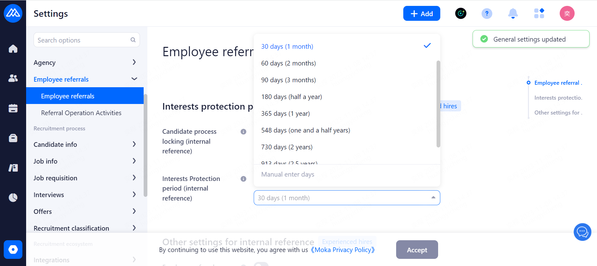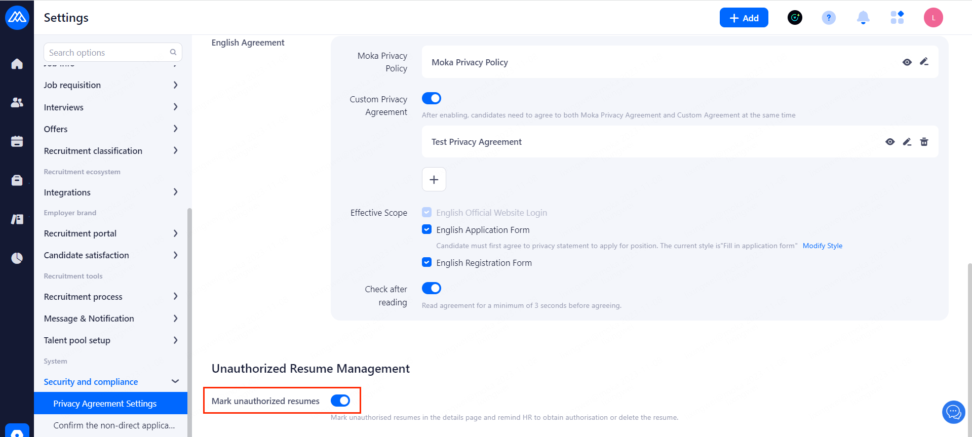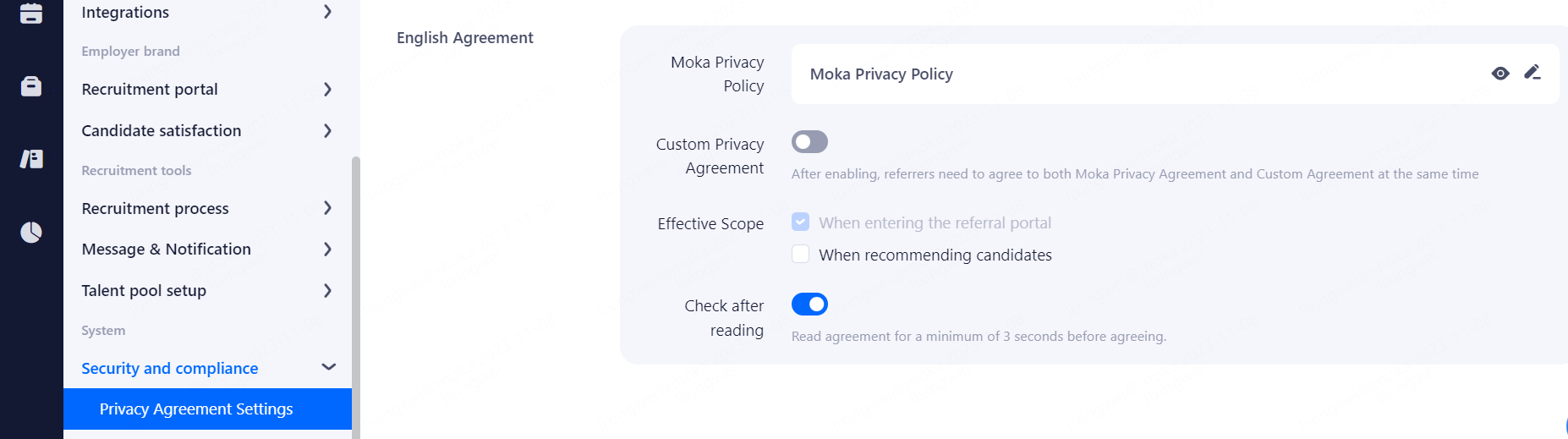 Custom Privacy Agreement: After enabling, candidates need to agree to both Moka Privacy Agreement and Custom Agreement at the same time.