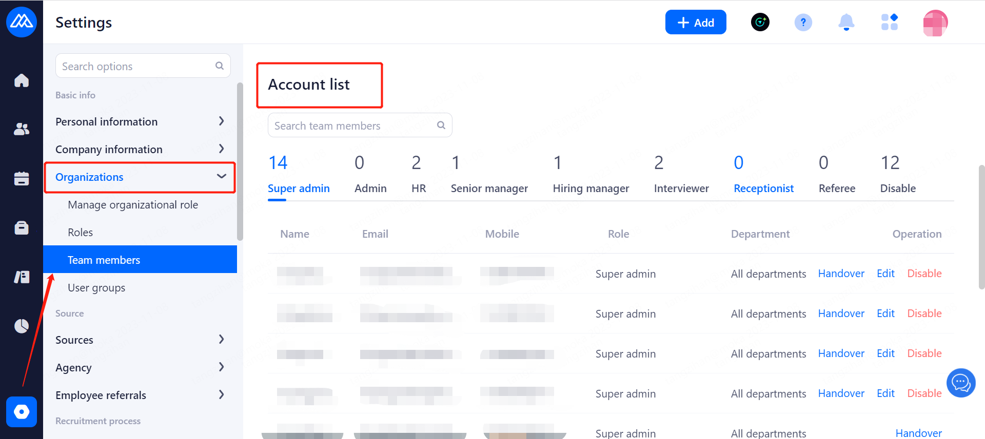 Go to Settings>Organization Management>Team Personnel Management.