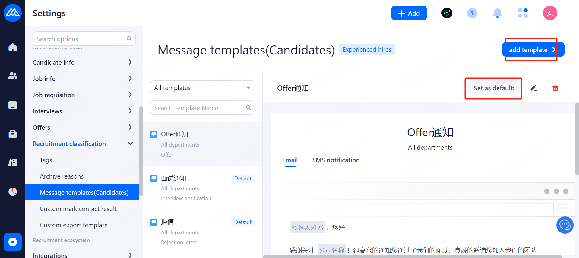 Candidate notification template: Recruitment Classifieds>Message Template Management>Candidate notification template