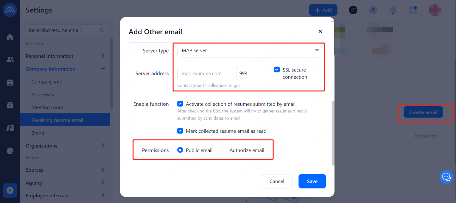 Used for receiving subsequent delivery of resumes from recruitment channels. When adding mailboxes, you need to choose the type of mailbox permission: