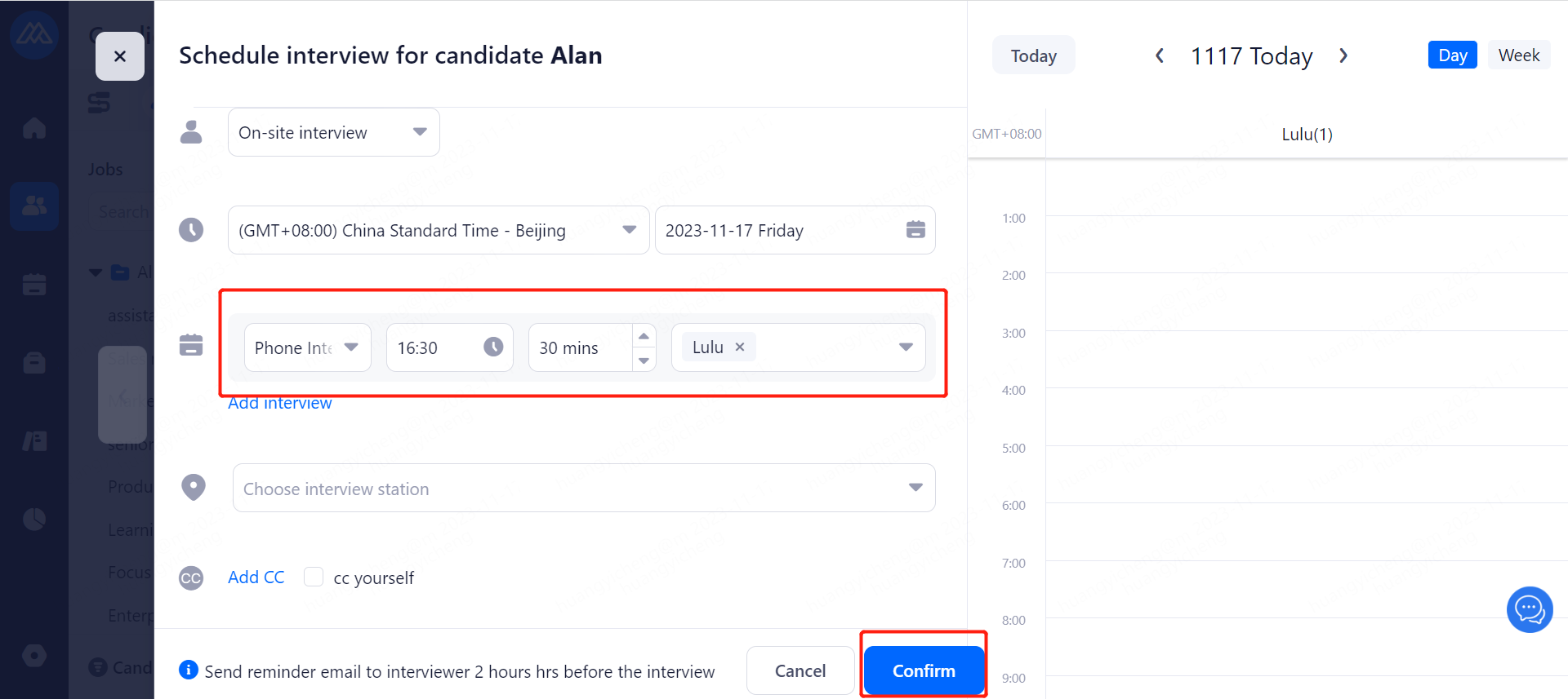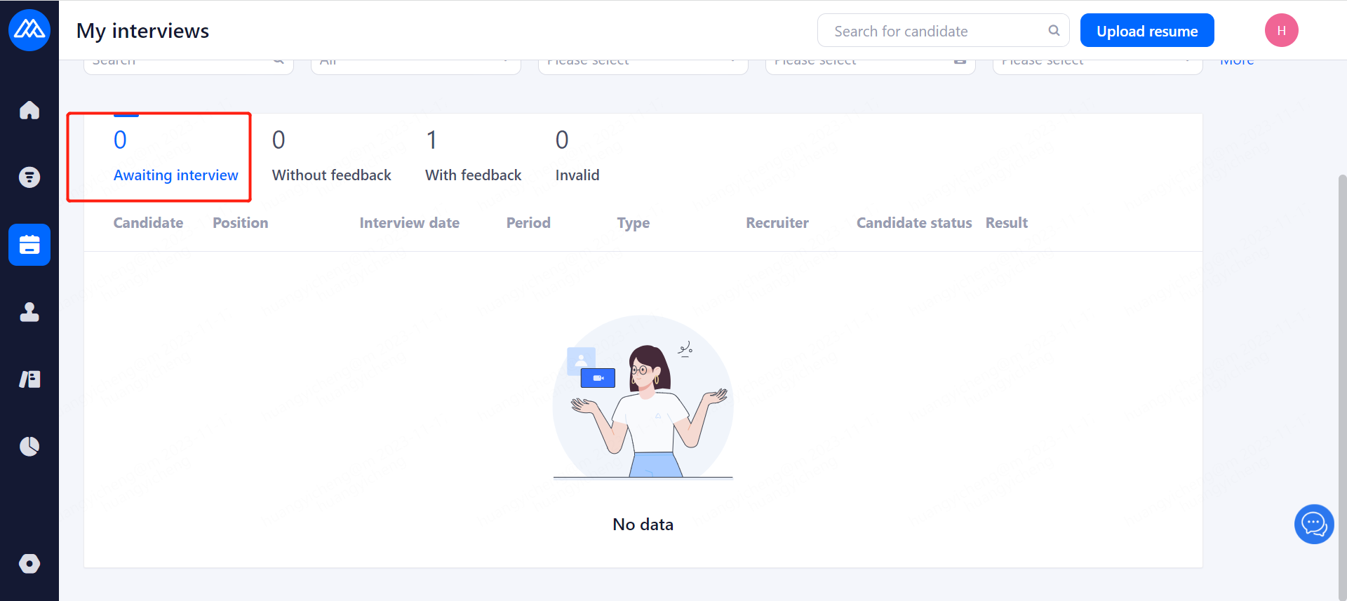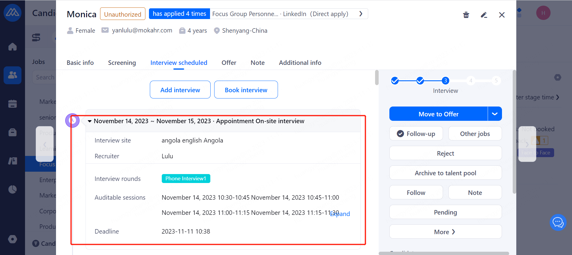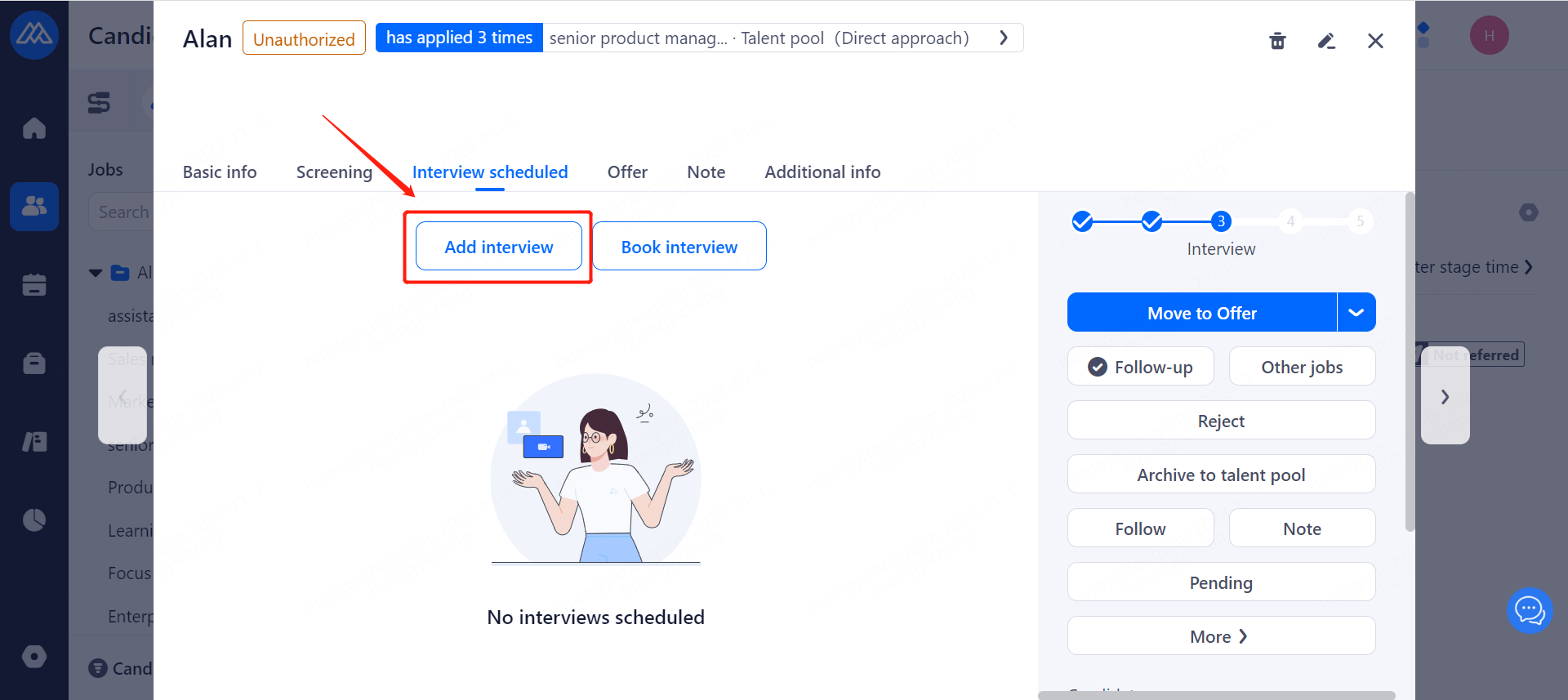 1. In the Candidate Management interface, at the interview stage, select a candidate who needs to be scheduled for an interview and click Add Interview: