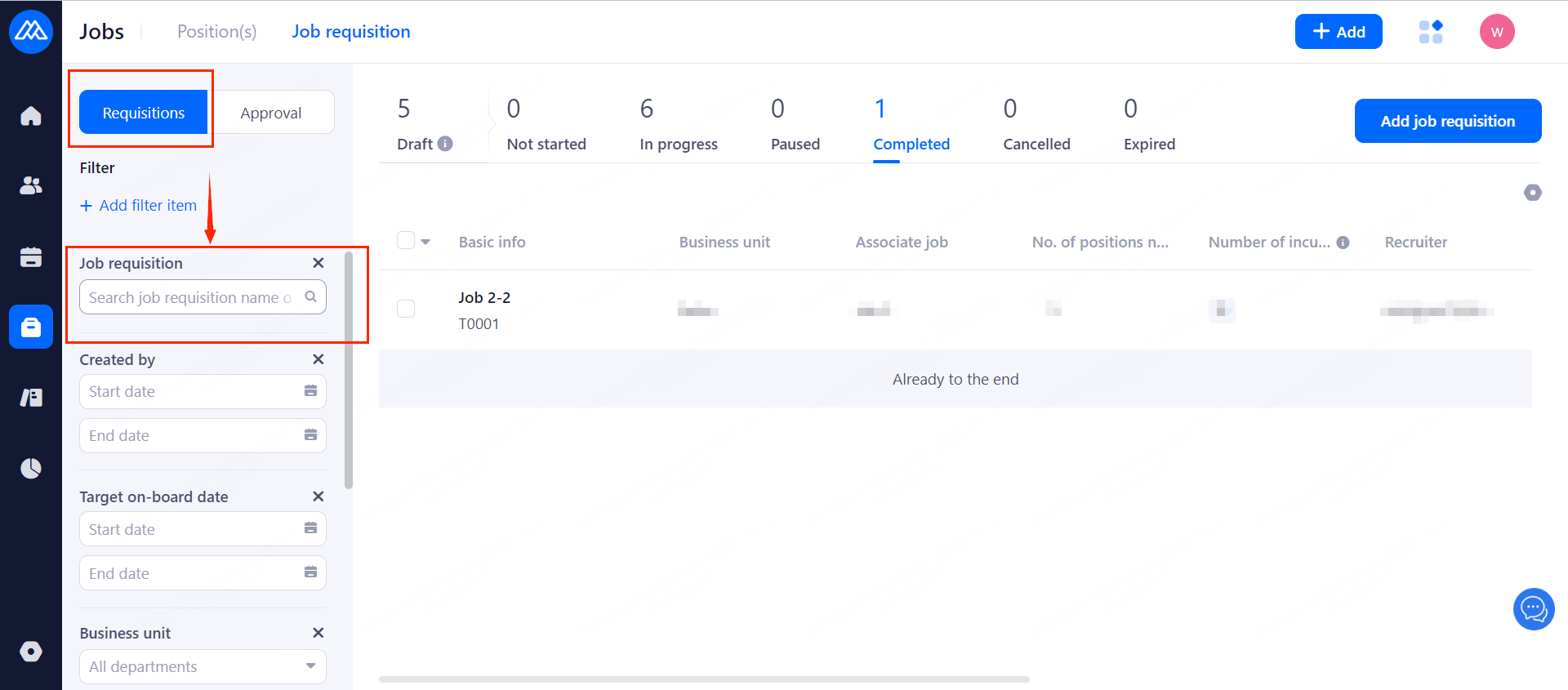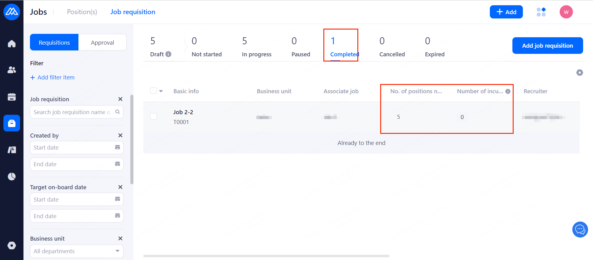 When the number of onboardings under the requisition equals the number of requisitions, the status changes to [Completed].