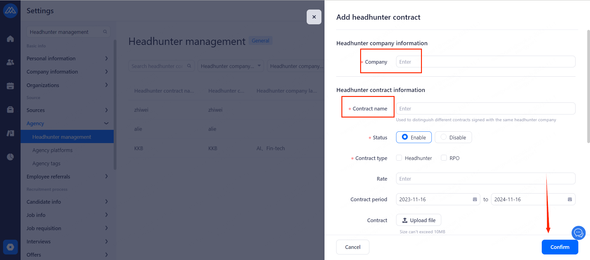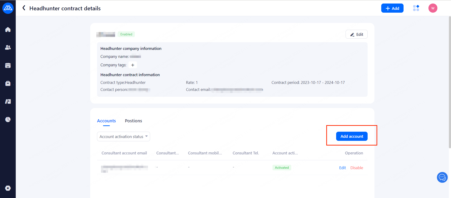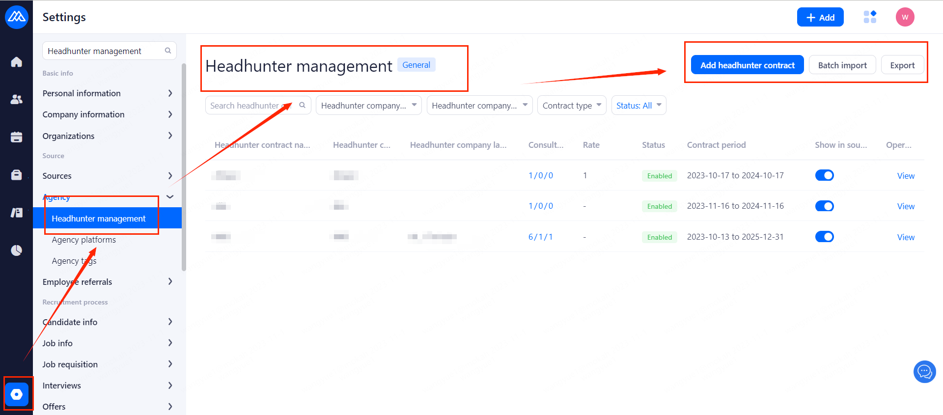 You can then enter the Headhunter Management page and click [Add headhunter contract] to add a new one.