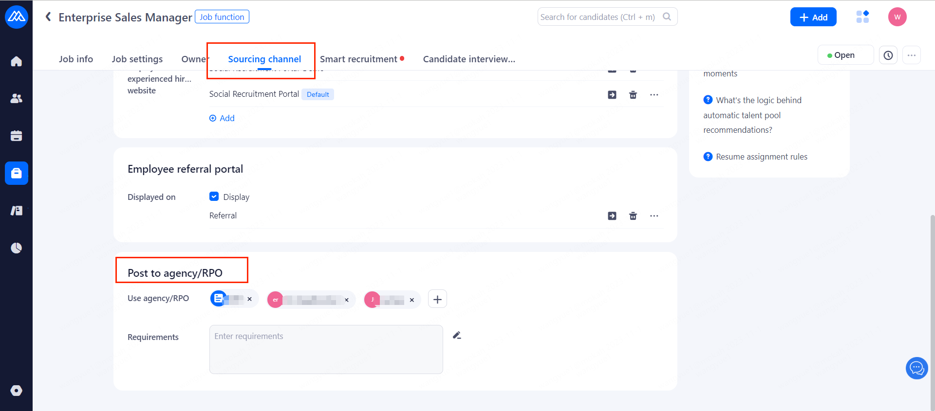 On the job details page, after clicking on [Sourcing channel] you can select the corresponding headhunter.Then the headhunter can see the position on the headhunter platform.