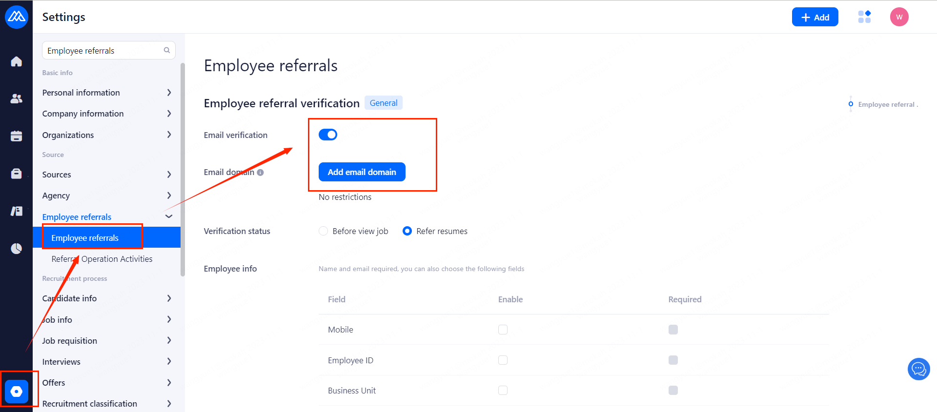 Find [Employee referrrals] on the settings page, turn on email verification, and add email domain.