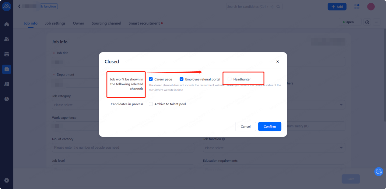 1. Position A is released by HR to all recruitment channels (including headhunting channels), which is closing one month later with the completion of the recruitment. When closing the position, the HR does not tick the headhunter on the prompt [close the position]. Therefore, the headhunter will not receive a reminder of job closure and continue to recommend CVs. But the candidate's recruitment status directly shows refusal when returning to the candidate interface.