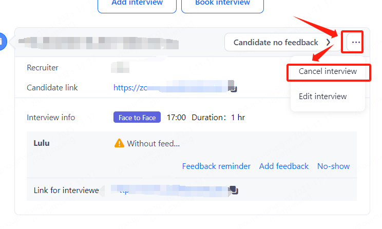 Go to Candidates, click on the appropriate candidate, click on the "Interview scheduled" stage within Candidate Stage Management, click on the Settings button with 3 dots on the right side, and click on "Cancel Interview" in the small menu that appears.