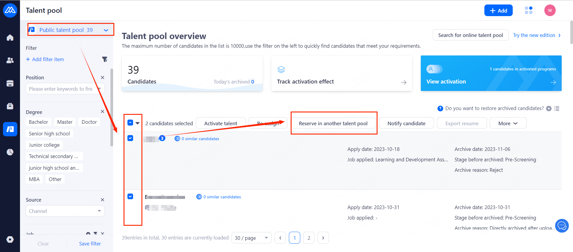 You can check them in talent pool, and then click the [Reserve in another talent pool] button above. The default talent pool does not support this operation.