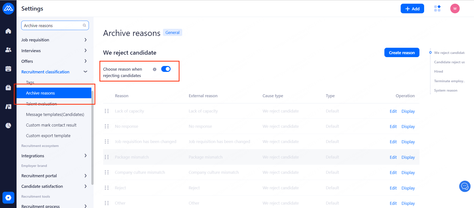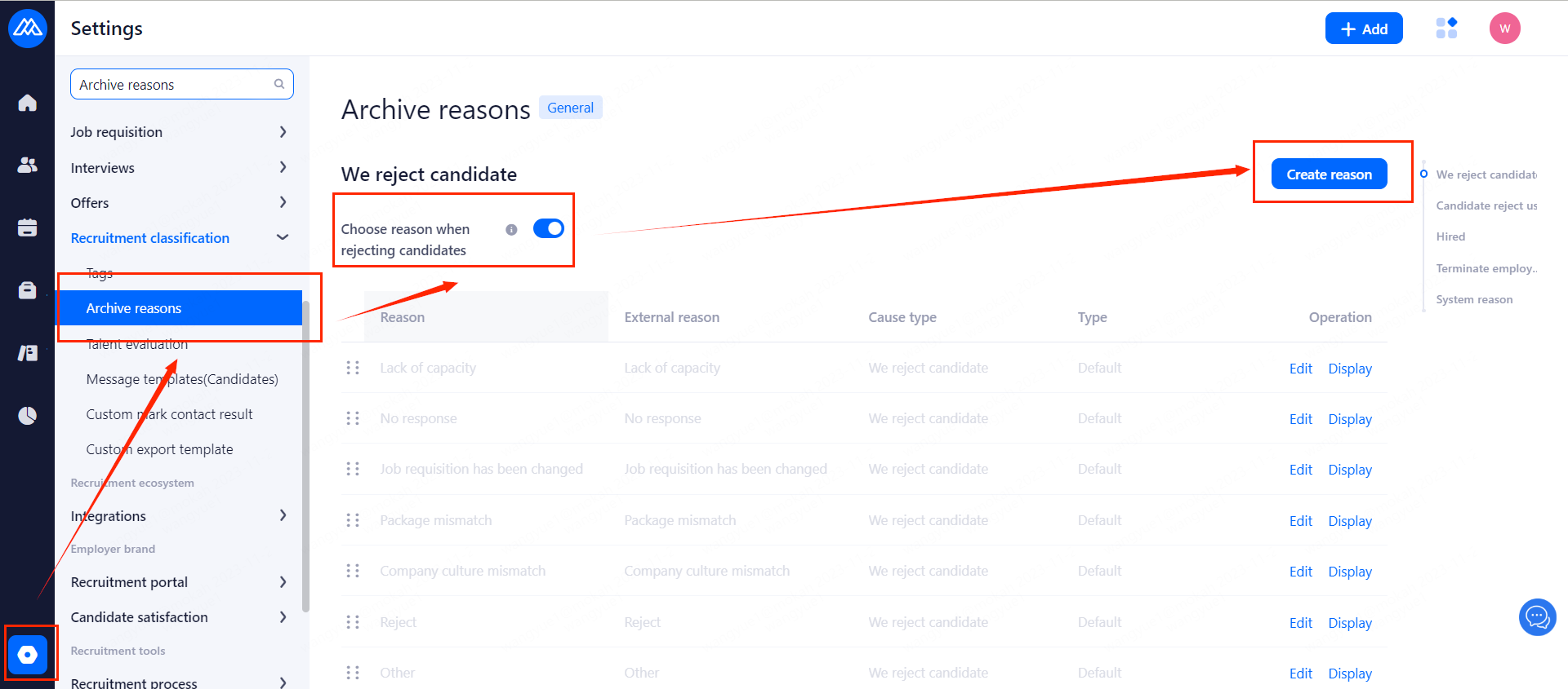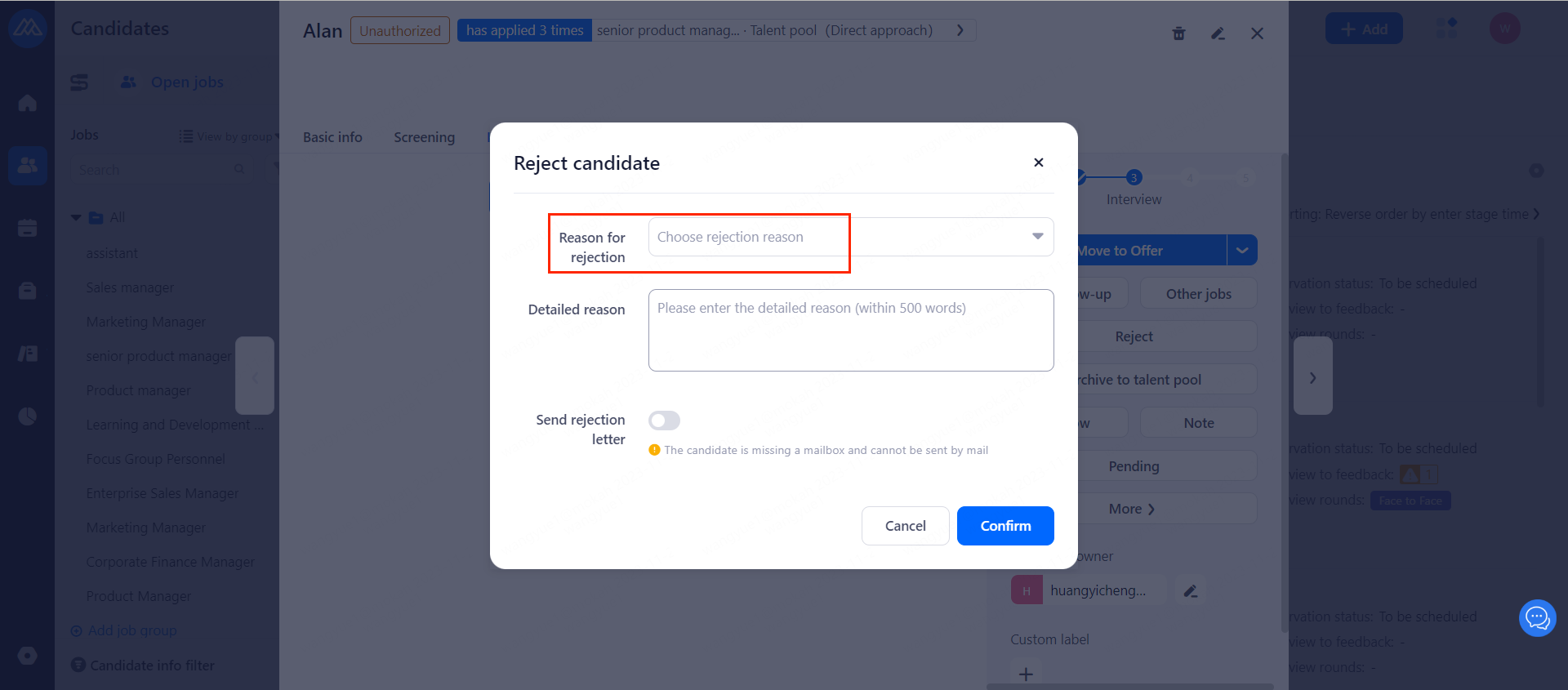 For candidates who have been eliminated, we can set some commonly used reasons for elimination, and turn on or off the function of selecting reasons for elimination in the settings management. When turned on, it is a required item. It should be noted that if the candidate is rejected in the "pre-screening" status, you cannot choose the reason for elimination.
