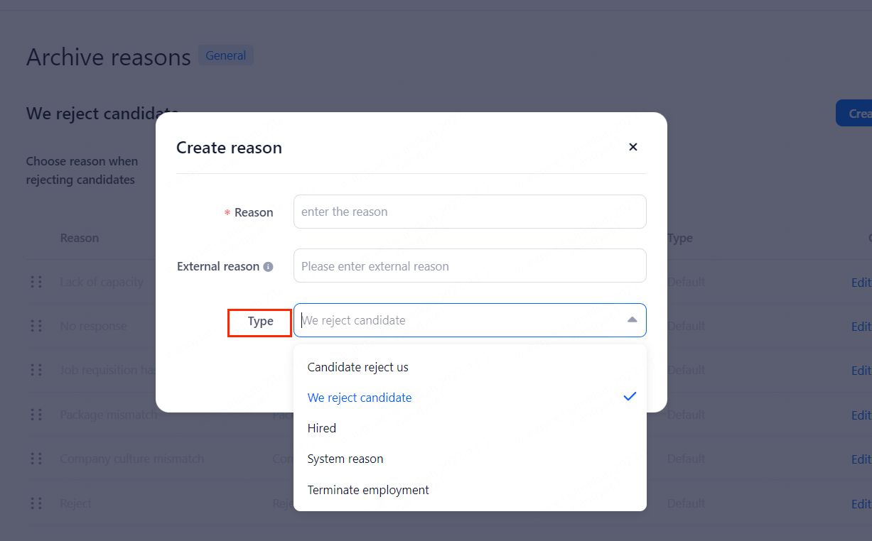 3. You can Create new reasons by hitting [create reason], and choose the type.