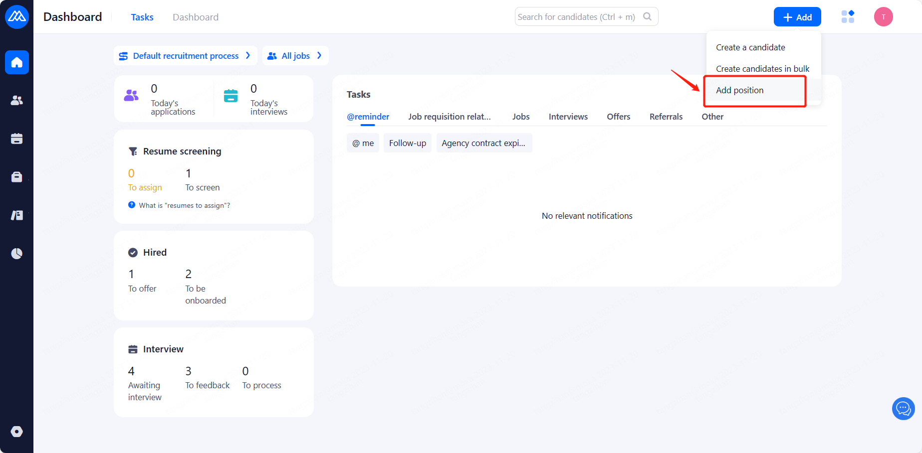 To add a new position, you can click the "Add" button at the top right of any module page and select "Add Position".