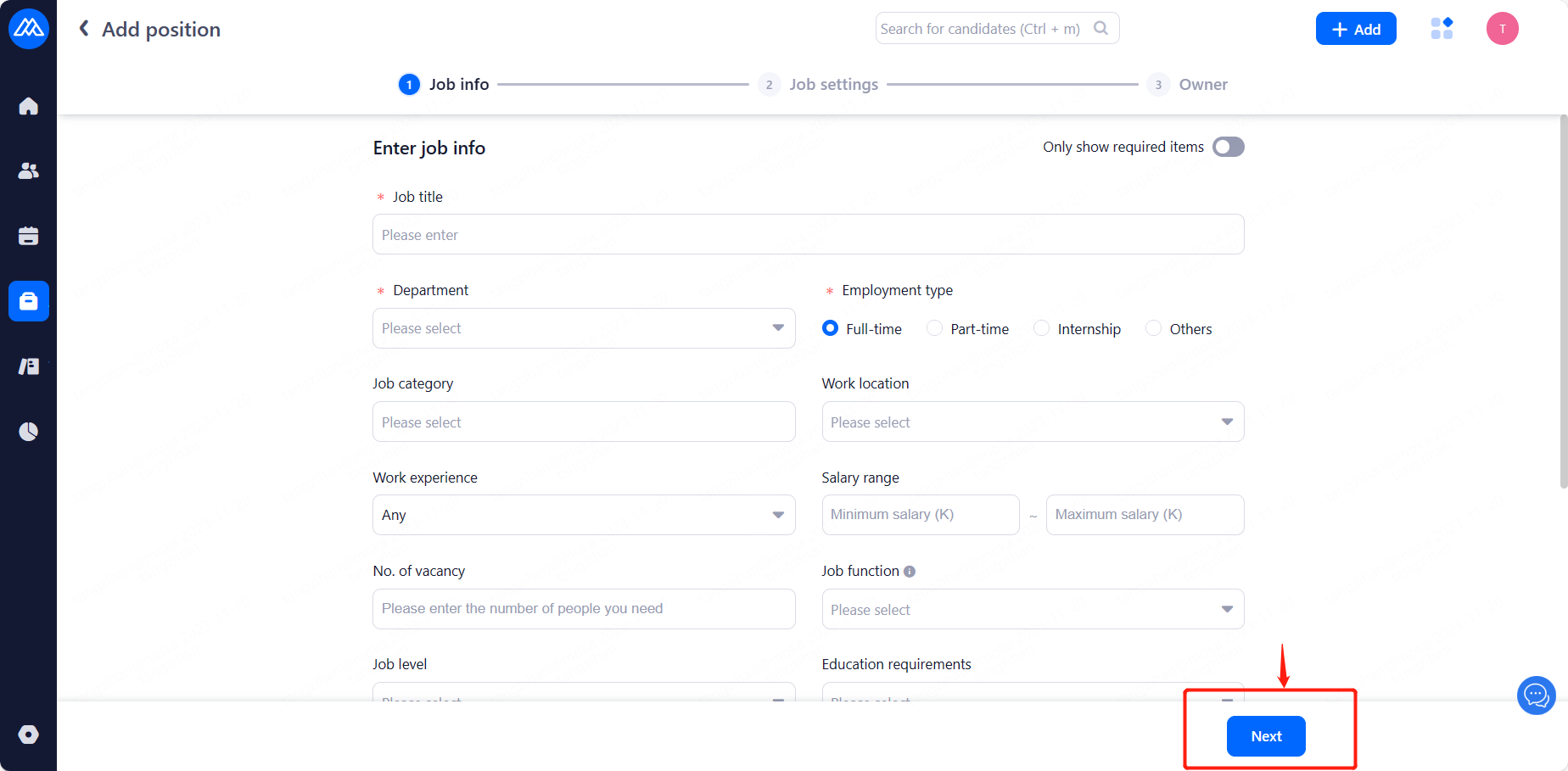 In the job adding page, please fill in the job fields according to the actual situation, and click the "Next" button below after the content is set.