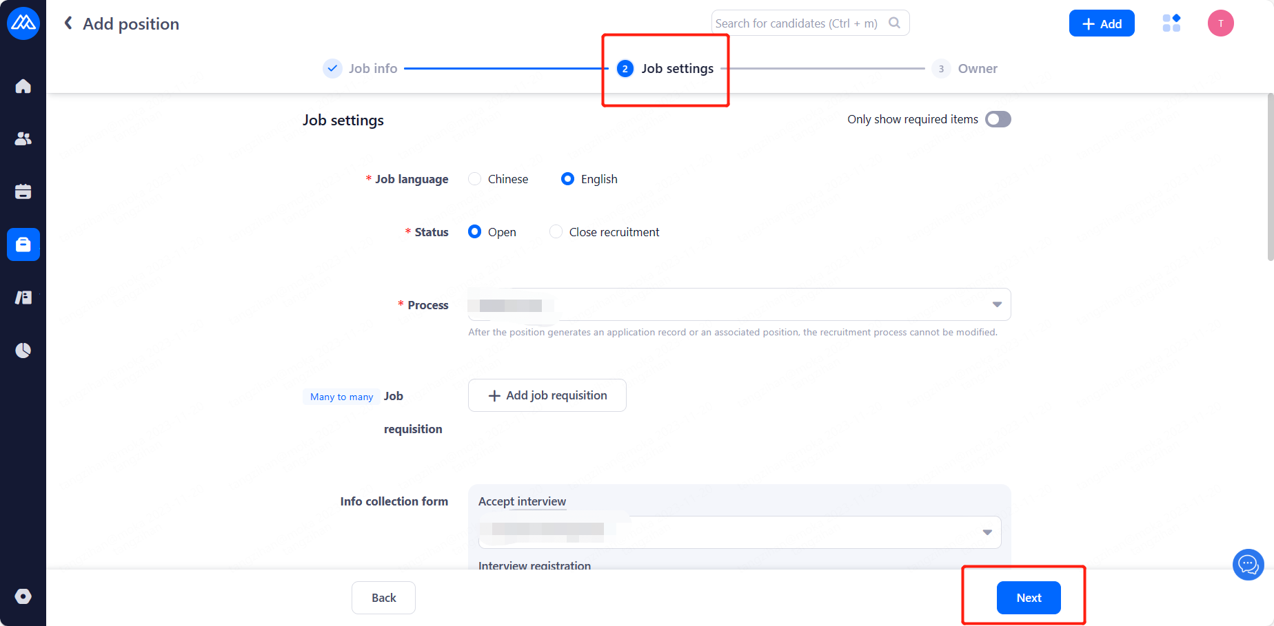 In the setup page, select the corresponding recruitment process and related content, and then click "Next".