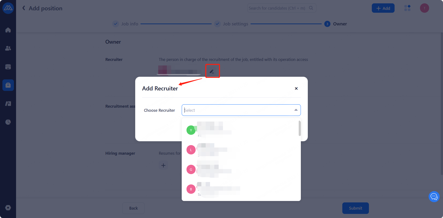 4. Into page of the person in charge, you can allocate roles including person in charge, recruitment assistant, hiring manager and interviewer to different people. The default person in charge of the position is the creator of the position. And you can click on the "Modify" button next to the current name to select if you want to change the person to another.