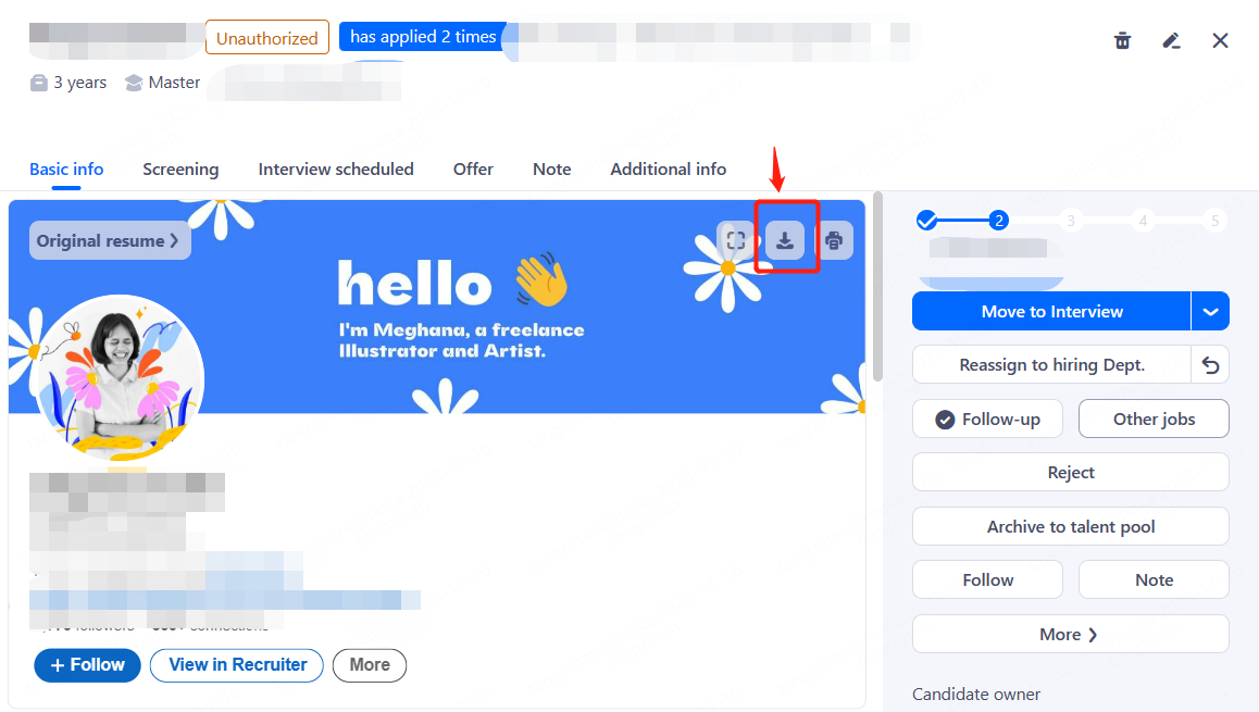 Interviewers can download CVs when they receive an interview arrangement by clicking on the download button at the top right of the CV page.