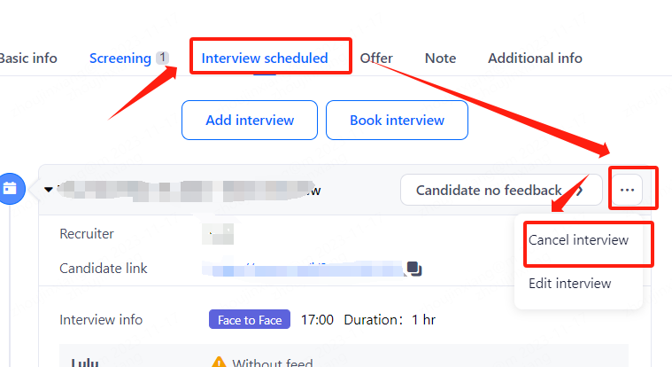 1、please enter the candidates, click on the corresponding successor to enter the stage management, and click on the "interview scheduled" stage, in the interview, please click on the top right of the three dots of the button.